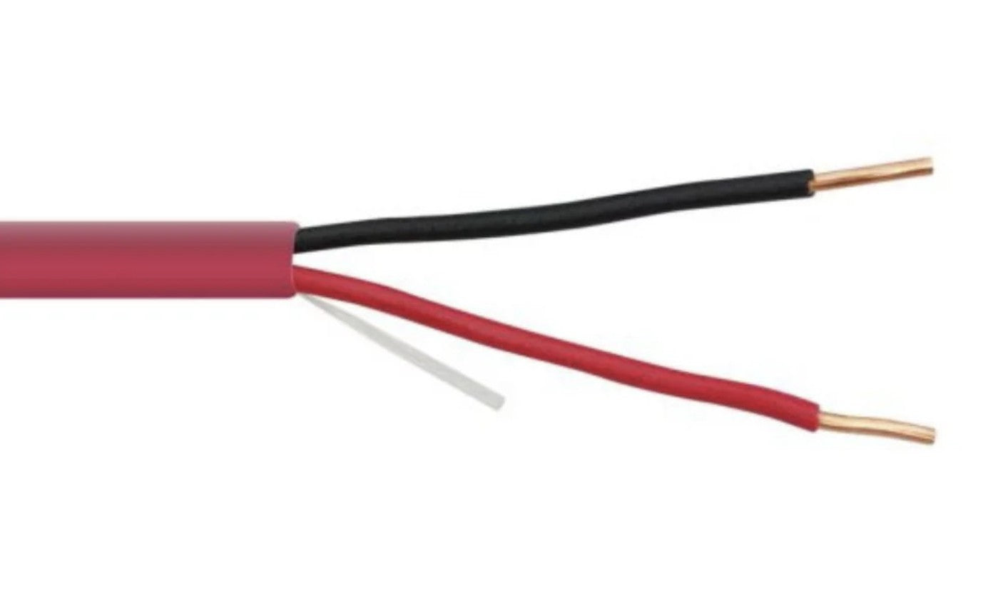 A 14/2 FPLP-rated red plenum fire alarm cable, designed for fire alarm systems in plenum spaces of commercial and residential buildings, ensuring fire safety with compliance to stringent regulations and providing reliable signal transmission.